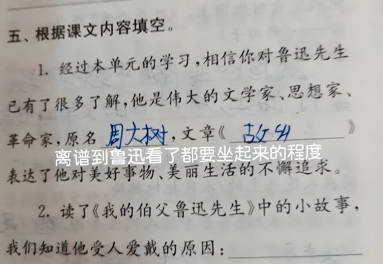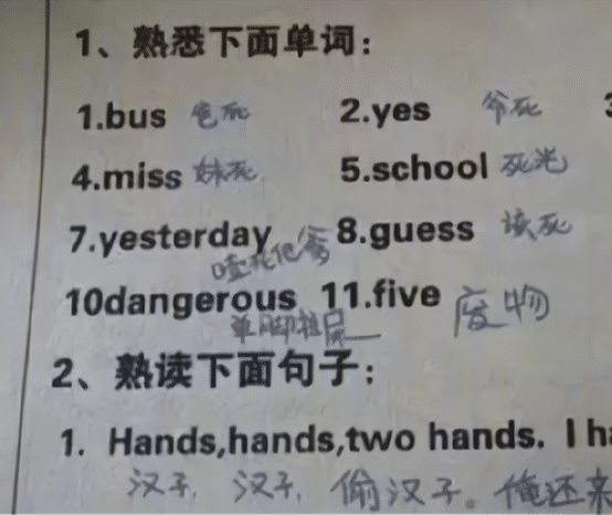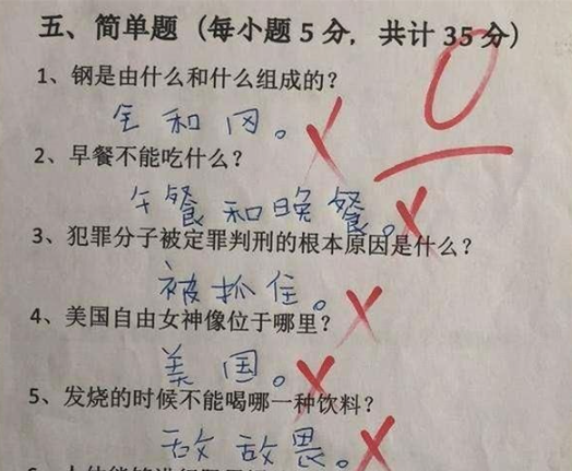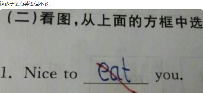 小学生“脑回路”的清晰程度,常常让人感到猝不及防。在家长和老师眼里非常简单的问题,可能对于他们而言,简直是天书一样的存在。于是,考试和作业中就呈现出一系列的奇葩回答。小学生“硬核”错题走红,会点英语但不多,老师满脸无奈笔者上学时老师跟同学的关系,还是非常严肃的风格。不要说在作业和试卷上乱写,就连平时说错了话都可能被严厉的批评。但时代在不断变化之中,教师们的管理风格也呈现了明显的变化。特别是年轻老师的加入之后,整体的教育风格都更尊重儿童的天性。 有时候,小学生即使在正式场合,说出让人忍俊不禁的想法,老师也会坦然接受。就连批改试卷时,也能发现很多有趣的回答,叫人一边生气,一边忍不住笑。有人总结了小学生的错题,他们写下的错误答案,简直堪称“硬核”。成年人很难想得到这种思路,可是有的同学却让你无法反驳。语文题中要求学生写出鲁迅的原名,这名同学估计是“一心二用”的高手。但是最后证明他的记忆力还是有点差,本来是周树人,他实在想不起来便写成“周大树”。 十年树木、百年树人,看来培养下一代真是很符合这句典故啊。“大树”和培养成材的“树人”,差距还很大,希望这位同学可以努力成长。下一位小学生,绝对是英语科目中的“硬核”作答。Nice to meet you 这句英语是基础阶段的句子,意思是很高兴见到你。 可是这名同学要么是吃货,要么就不免叫人脊背发凉了,竟然写成了eat(很高兴吃掉你)。虽然发音有相似之处,可是差得十万八千里。老师看完满脸无奈:这学生会点英语但不多。还有个同学,已经是高年级了,但英语的基础似乎很差。完形填空基本上都不会做,但是看到e打头,就忍不住写成emo。这其实算是网络用语,意思是情绪化、心情不好。也许面对这空荡荡的试卷,看到别人奋笔疾书,自己却啥也看不懂,这才是这位学生当时的心情吧。