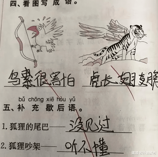 看图写成语对小学生来说可能比较难,小学生成语词汇量很有限,往往天马行空地写下四个字就认为是成语了。比如第4题,这位学生洋洋洒洒写下了“鸟很害怕”,“虎长翅膀”,歇后语也是诚实地写下内心的答案。 阅卷老师看了都要无语住了。