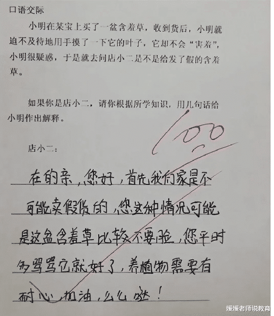这道题是一道口语交际题,题中小明在网上买的商品有点问题,让学生根据所学知识作出解释,这位学生回答的这套模板有种非常似曾相识的感觉,看来是没少网购吧。