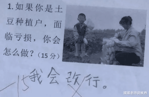这道题问的是如果你是土豆种植户,面临亏损,你会怎么做?学生回答的是“我会改行。” 在考试中这样的回答肯定欠妥,但是从实际出发,这位学生的回答也不是没道理的,及时止损也是解决问题的方法。