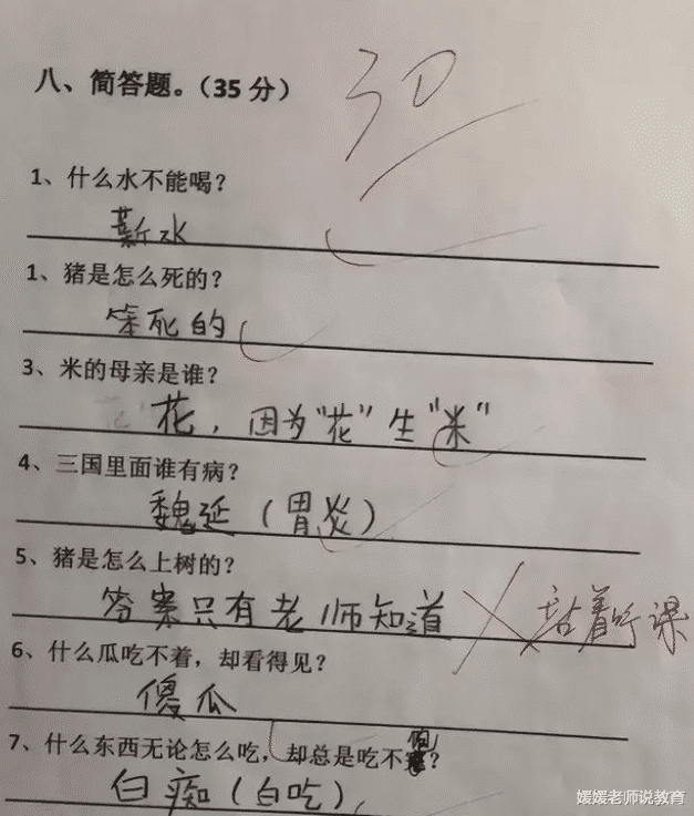 在各个学生阶段,小学生应该是最容易让人“惊喜”的阶段。他们脑洞非常大,天马行空,有时候问的问题也常常让人不知如何回答。而小学生的可爱不仅体现在生活中,在考试的时候也常常让老师“意想不到”。 我们一起来看看这些小学生的奇葩脑回路吧。