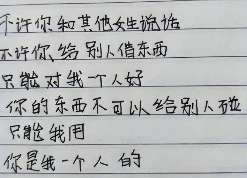 原来成长在强势的家庭氛围中的学生有很多,这名小学生也是一样,不许你和其他女生说话,也不许你给别人借东西,要是不遵守规则的话就分手,真是没想到小学生竟然能够如此霸道。 对于这样的现象,家长应该进行制止,同时还要进行自我反思,有必要改变家庭氛围,只有这样,小学生才能从根本上做改变,当然,对于小学生对待学习的状态,家长也有必要进行调整,对待学习要认真,而不是三心二意。