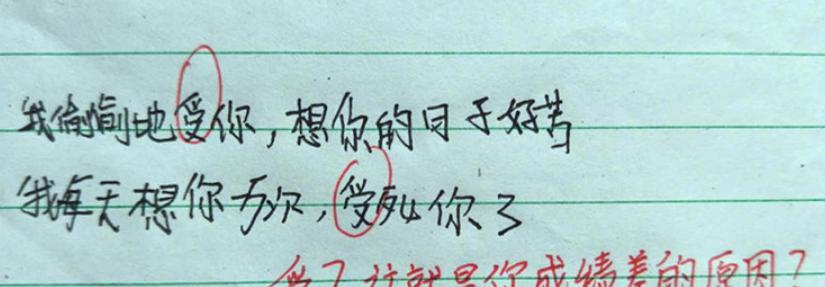 众所周知,小学生的年纪小,不管是在日常做作业中,还是在考试时,都会写错字,这不仅是马虎的表现,也是学生平时不认真学习的象征,但如果这种错误出现在情书上,还真是会闹出笑话。 可以看到小学生将“爱”写成了“受”,虽然只是短短的两行情书,但读起来真是别扭极了,被班主任发现后,班主任表示,这就是你成绩差的原因,从表面上来看,班主任的言辞是一种讽刺,但实际上这会给小学生带来很大的学习动力。