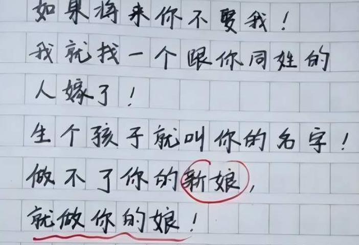 小学学霸“情书”走红,家长看后哭笑不得,班主任:加油看好你!这名小学生倒是很霸气,连老师都直呼:服了,如果将来做不了你的新娘,那么就做你的娘,字字句句都充满着霸道的气息,而从这样的言语当中,可以感受得到,小学生的家长也很强势,所以才会出现这样的现象。 这是一种优势,但也是缺点,不管遇到任何事都应该理智对待,而不是如此强势的解决问题,家长有必要调整自己,否则随着学生的年龄上涨,学生很有可能做错事,家长该意识到问题有多么的严重。