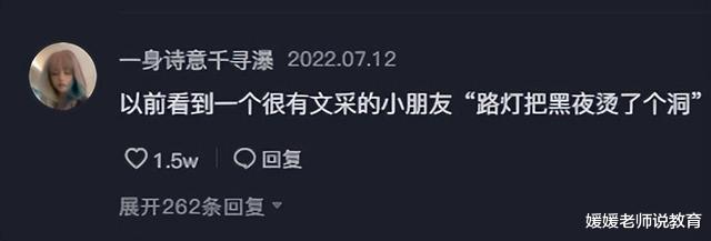路灯把黑夜烫了一个洞,我一直觉得这位小朋友只这一句便可封神,多么形象的比喻,多么诗意的描述,让人脑海里瞬间有了一个场景,一个形象,微弱的路灯点亮了黑暗的一角,孤独又温暖,凄凉又向往。