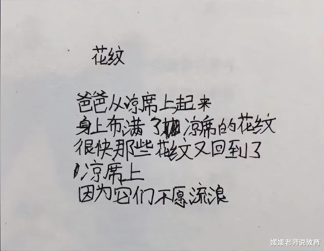 《花纹》利用拟人的修辞手法将爸爸身上的花纹写活了,花纹就像一个调皮的孩子来到爸爸身上玩耍,更像一个离不开家的孩子,夕阳落下,就回家去了,因为它们“不愿流浪”。看到这首诗,想必很多在外求学或者工作的孩子更有共鸣,希望你们在外一切安好!开心顺利!