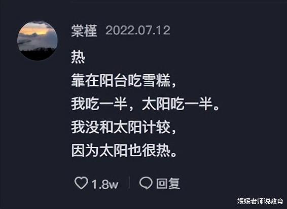 咱就说,迟早要被小学生的才华惊讶死,我想说其实不止是太阳偷吃一半,其实风也偷偷啃了一口,还有隔壁小孩的眼睛也跟着悄悄偷吃了几嘴呢!哈哈……让我想起了另一首诗,“我坐在阳台抽烟,我抽一半,风抽一半,我没和风计较,大概风也有忧愁吧”。 如何看待小朋友这些神作?小朋友看世界的角度总是不同于大人,他们有对这个世界独到的理解和感悟,无需过度干预,反而我们要保护孩子的这种天性,无拘无束,孤独自由,但是快乐和幸福。