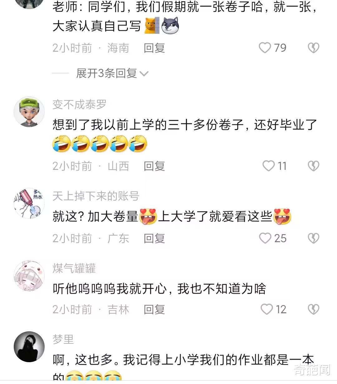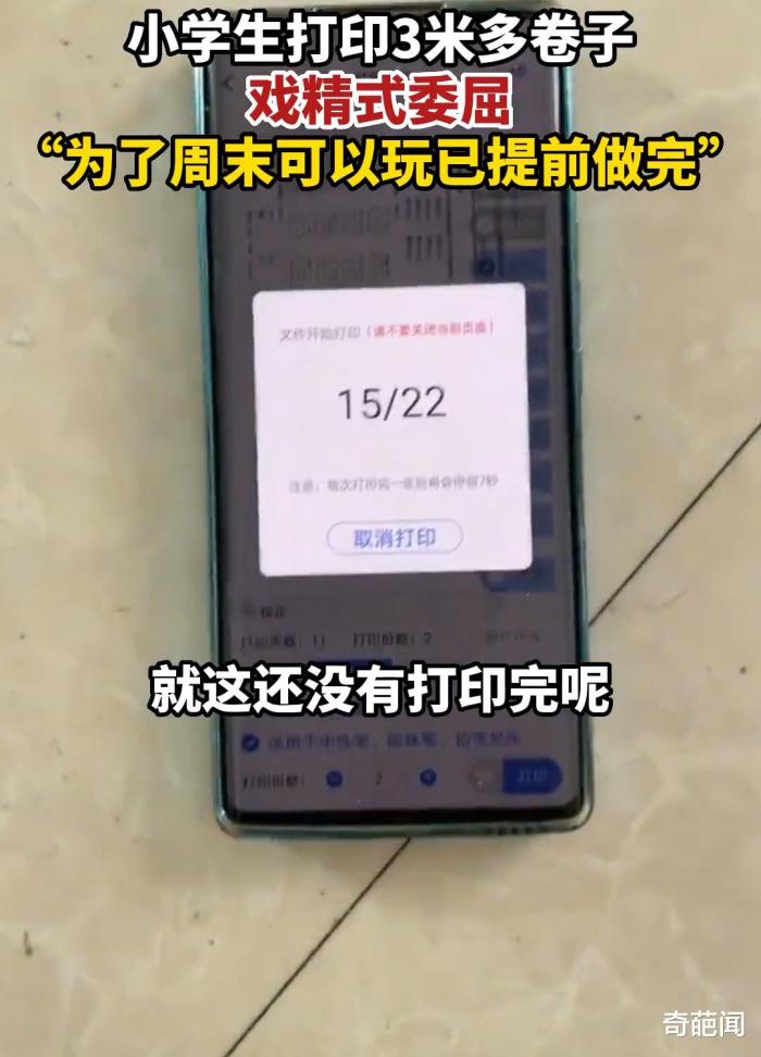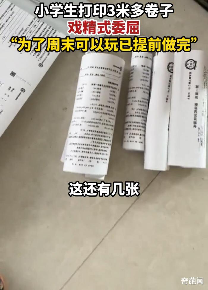 一到放假期间,作业就成了家长和学生们热议的话题,作业太多或者没有作业都不行;元旦假期3天如果没有作业,学生开心,家长开始伤脑筋;如果有作业,学生就发愁,家长又着急写不完,真是进退两难。  近日河南周口一孩子就在某社交平台上吐槽了一段放假期间老师布置太多作业的视频意外走红网络, 虽然如今各中小学“双减”政策已经落地了,但为了孩子们的前途着想,仍有一些家长和老师喜欢给孩子布置较多的作业,令其苦不堪言。 视频画面中这位小男孩正在打印老师给他布置的语文作业,当看到卷子打印出来足足3米多长堆满一地,然后居然还剩7张没打印完后,男孩顿时感到委屈不已并直呼:“老师真是太狠了,这太多了呜呜呜”。 相信一些网友看到这里也开始为小男孩打抱不平,一门学科就这么多作业,要是再算上其他几门功课怕是元旦这三天假期不吃不睡都做不完了吧?随着视频在网络上发酵,小男孩的妈妈最终出来解释道。 妈妈坦言道:“孩子在上小学四年级其实也就6张试卷,只是当时是单面打印的,所以就显示有了24张3米多长的情况,针对老师布置的作业,自己也理解毕竟临时期末考试了,好在孩子为了假期能出去玩,加班写到23:00才写完”,对此网友议论纷纷。网友观点:有网友评论说,这是一种病态,所有人觉得自己穷是因为不够努力学习。还有网友评论说,我觉得现在的孩子比大人还难,大人做事,有时候还要看心情,可是小孩子就不同了,在家有家长,在学校有老师,简直插翅也难逃。 也有网友评论说,老师布置作业多一点可以理解,现在的问题是作业是老师布置的,批改作业就不是老师自己了。笔者觉得对于作业老师需要从适合学生本身的学习状态出发,布置适合他们的作业量,而家长面对孩子作业量大的情况,也应与老师及时沟通,采用正确的方法解决孩子作业问题,对此屏幕前的小伙们们你们是怎么看待孩子作业多的问题呢?