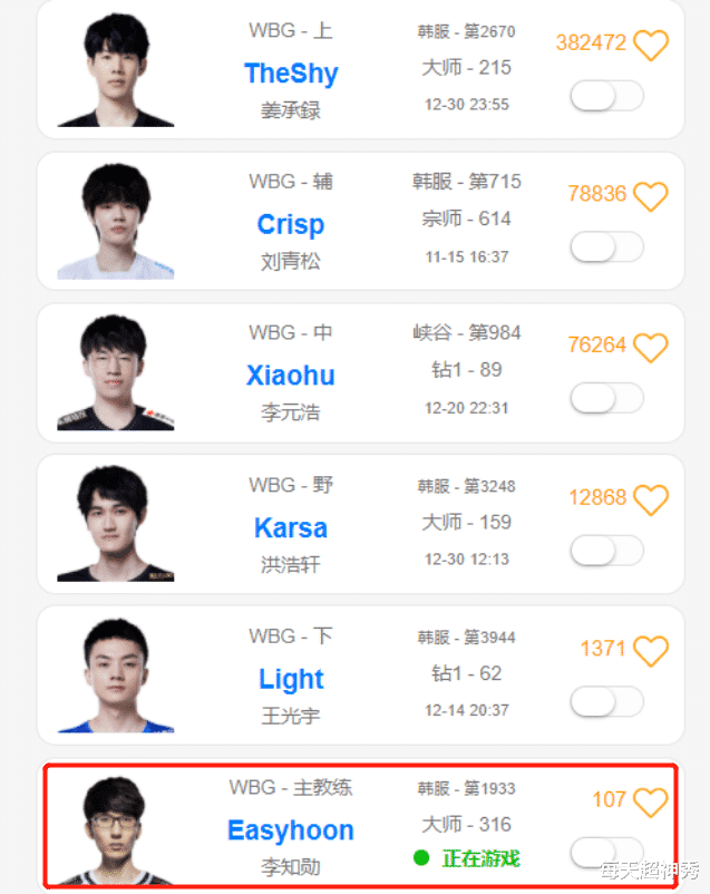再看同样呼声高涨的WBG战队,在韩服战绩最抢镜的成员不是Theshy、松少Crisp、前RNG队长小虎、卡萨Karsa、灯皇Light等职业选手,而是WBG战队的主教练Easyhoon(曾经与Faker李相赫轮换的前SKT中单)。 你没有看错,截止发文时间,Theshy、Crisp、小虎、卡萨等选手悉数离线,唯独WBG主教练Easyhoon全身心投入Rank,凭借出众的个人能力,他已经顺利冲上大师316胜点,虽然早已退役,但冠军中单Easyhoon的竞技状态依旧值得高看。