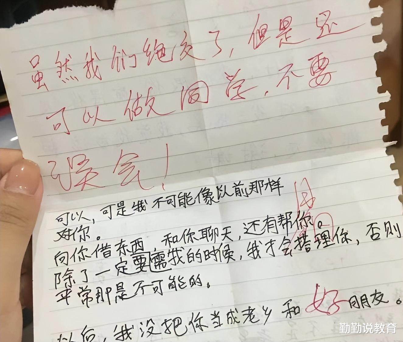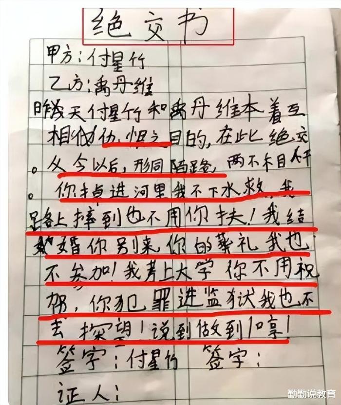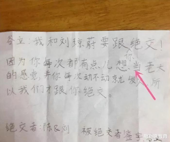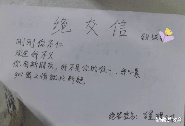 小学生“绝交书”走红废话连篇型:虽然绝交了,但还可以做同学小学生即便是绝交的情况下,似乎还会给对方留下那么一点点余地,不像成年人之间的绝交,可能真的就断绝了往来。就像这名小学生的绝交书,“虽然绝交了,但还可以做同学,也希望你不要误会”,怎么说呢?绝交会绝交,但是同学还得做,不过这名同学看上去也是比较理智的,毕竟也不能因为绝交而失去了同学缘分。 直截了当型:4个字告诉你,咱俩完了!小学生之间的绝交可能大多数都是因为一件小事,不过有时候他们在绝交书中也不会说出过多的理由,语言简洁,直截了当。“咱俩完了”,简简单单的四个字,让对方瞬间心凉,但是落款处的一句话也让网友哭笑不得,这是在给自己台阶下吗? 有理有据型:因为你总想当老大,所以绝交吧小学生的想法本身就是古灵精怪的,他们看待事情的角度不同,所以很多事情可能不像他们想象的那样,难免会产生一些误会。而这名小学生绝交书可谓是有理有据,“你总是给我一种想要当老大的感觉”,当朋友可以,但是想当我老大门都没有,所以绝交吧! 占有欲强型:因为我不是你的唯一,我心累小学生之间的友谊是比较纯粹的,但是他们似乎也是一个占有欲比较强的群体,可能今天自己心目中的好朋友,和其他的小朋友说上一句话,或者玩得很开心,就会让自己极为嫉妒。而这名小学生就是因为觉得自己不是对方的唯一,甚至还表示“我心累”,所以闺蜜之情就此断绝吧,占有欲真是太强了。 不留余地型:我结婚你也别来,你进监狱我也不去探望小学生的气性有时候也挺大的,他们可能也是因为太在乎朋友的存在,一旦认为对方是自己的好朋友,就会付出真心去对待,当然,如果对方做出让自己生气的事情,说话也会像仇人一样。看到这名小学生的绝交书,很多网友表示:这应该是下定决心了,毕竟把所有可能发生的事情都说了一遍,一点都不留余地。