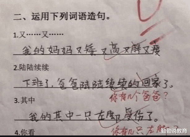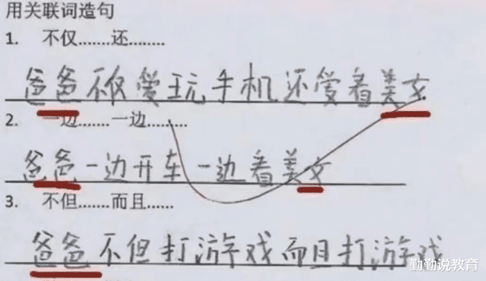 小学生试卷“造句”火了,句句离不开爸爸,老师:回家让你妈签字小学生的想法相对来说是比较简单的,他们不会像大人那样考虑得比较全面,在试卷中暴露出爸爸妈妈的小秘密也是再正常不过的事情。而这名小学生在试卷中完全离不开爸爸,不过爸爸看上去就没有那么开心了,毕竟自己的那点事全让老师知道了。 这张试卷的题型是造句,“爸爸不仅爱玩手机,还爱看美女”、“爸爸一边开车一边看美女”、“爸爸不但打游戏,而且打游戏”。能够从这张试卷中看出,爸爸的爱好只有两个,玩手机游戏和看美女,而老师也是毫无情面:回家让你妈签字!也不知道这位爸爸感想如何。