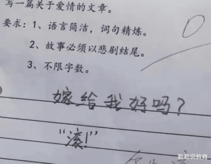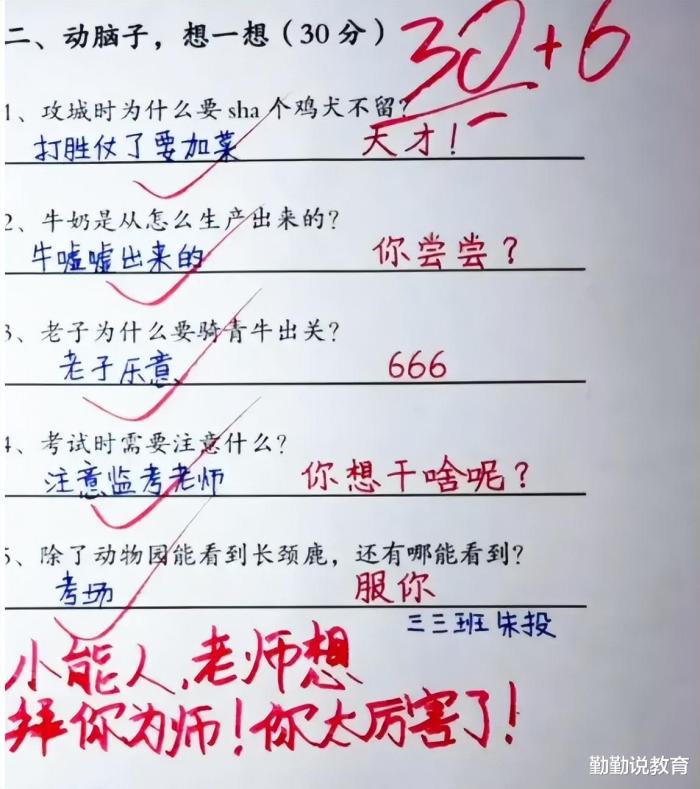小学生试卷答案走红,脑洞清奇让老师哭笑不得“牛奶是牛嘘嘘出来的”现在的小学生试卷,呈现出来的题型基本上都是比较活灵活现,倾向于考验同学们的思考能力,而小学生的回答也不会让人失望。这道题类似于脑筋急转弯,题目中给出的问题是“牛奶是怎么生产出来的?”也是在考验小学生的常识问题,而这名小学生的回答是:牛奶是牛嘘嘘出来的,老师看后也哭笑不得。 “丰满的老师”看上去也并非毫无违和感小学生连线题也是比较常见的题型,其实像这类题型说简单也比较简单,但如果有一个连错,那么就会牵连到另一个。而看到这名小学生的连线题,老师自己都笑了,“丰满的老师”、“亲爱的羽毛”,不过很多网友表示:或许这道题只错了一个,不得不说现在的小学生知道的事还挺多,他们也能够给大家带来很多快乐。 “将爱情看透了”,6个字的爱情文章很真实小学生试卷中也会出现一些让同学们自由发挥的题型,就像是这道题,让同学们写出一篇关于爱情的文章,需要语言简洁,但有一个重要的要求,就是故事要以悲剧结尾。这名小学生采取自问自答的形式,“嫁给我好吗?”同时回答了一个字“滚”,不得不说这也足够彰显出爱情的悲惨,而网友调侃:这是将爱情看透了。