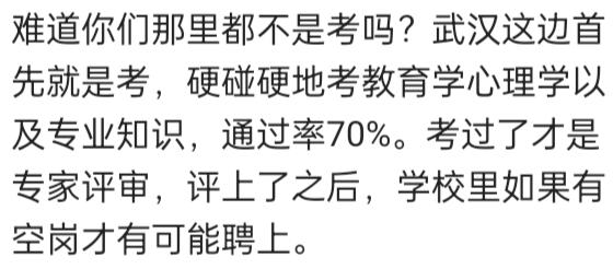 《教师法修订草案(征求意见稿)》的截止时间至今已经过去一年多了,虽然新版《教师法》还未正式颁布实施,但修订草案对中小学教师高级职称评审做出的规定却让人印象深刻:副高级以上职务应当与岗位设置相结合,考察教师履职的表现,设定相应比例,通过评审等方式竞争性获得。之所以说让人印象深刻是因为与初级和中级职称评审的新变化相比较高级职称评审与之前并无两样,尤其是通过评审等方式竞争性获得的明确更是表明中小学教师高级职称评审仍将一如既往的竞争激烈。这里所说的通过评审等方式当然包括破格方式,也很有可能会包括有些地方一直都在采用的考试方式。昨天有位武汉的老师在我相关文章底部评论区里留言(如上图所示),说武汉教师职称评审一直都是采用考评结合的方式,先是参评教师参加教育学心理学和专业知识考试,考过了才有资格参加专家评审,评审通过后学校有空余岗位才能最终聘上相应的职称级别并享受相对应的职称岗位工资。由于一直以来职评过程中存在着包括材料造假、证书失真、人情路线、暗箱操作等等不正之风,高级职称激烈的竞争渐渐演变成了一种有失公平和公正的不当竞争,因而很多老师也都是一直在呼吁要取消职称,当然取消职称制度是没有可能的,不过,也有不少老师呼吁采用以考代评的方式。以考代评就是以考试完全取代评审,这种做法的缺陷也是明显的,最为关键的是有关教师的师风师德等是无法通过考试反映出来的。考评结合的方式还是较为科学的。现有不少省市区卫生系统的副高级以上职称都是采取“考评结合”的方式,业务能力水平考试合格者才可以报送评审材料,考试成绩三年有效。