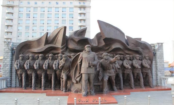 雕塑是由 26 位统帅、领导和英雄所组成,这雕塑代表着第一次过江的26 万志愿军将士。 在雕塑的最前面就是彭德怀司令员,右边手指向前方的这一位就是毛岸英,左边这一位是抗美援朝战争中,我军唯一牺牲在战场上的最高将领、原五十军代军长蔡正国。 后面从第一排开始依次是杨根思、黄继光、孙占元、杨连弟、邱少云等,在杨春增和杨育才后面是整个雕塑里面的唯一一位女性刘秀珍。 她曾经带领三名医护人员医治了 1200 多名伤员,并创下无一人死亡,无一例事故的世界战地救护史上的奇迹。