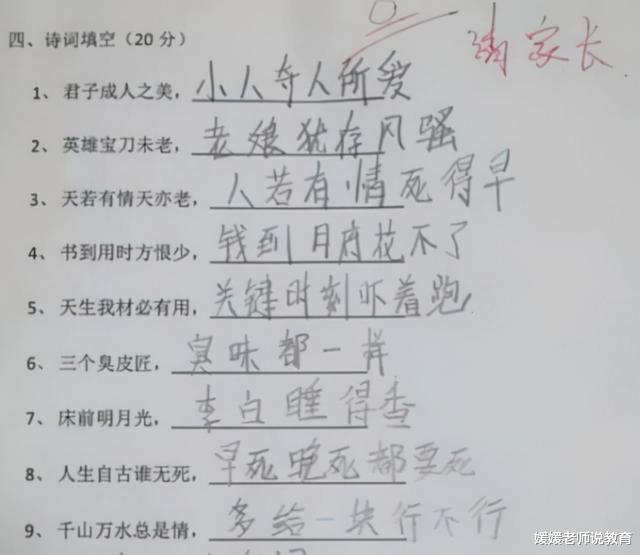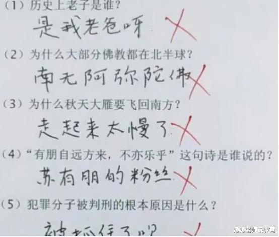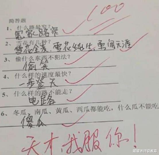 小学阶段作为孩子学习路上的初始时期,是学习的基础,对今后的学习有着非常重要的作用,对于孩子的辅导,家长们也是绞尽脑汁,稍有不慎就会出现“鸡飞狗跳”的情况,于是出现了“不写作业母慈子孝,一写作业世界乱套”的真实写照。 笑趴下了!小学生刁钻角度回答问题,老师直呼:这是我老师!孩子刚从幼儿园步入小学,思维上还不能很快适应小学的学习强度和内容,于是乎会出现一些“不守规矩”的情况,常常会闹出很多笑话,下面就一起看看小学生那充满魔力的脑袋又开出了怎样让人啼笑皆非的花朵。