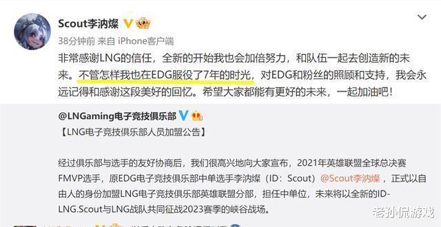 LNG在欢迎Scout的加入之后,小学弟们也纷纷向这位官宣转发并顺便向老东家道别,他说自己无论如何都已经在EDG工作七年了,谢谢大家的关照以及粉丝们的支持,并且将永远铭记这段美好的记忆。LNG打野Tarzan下方点评:后期中路遇到危险切记要喊我!看得出来他们之间的关系非常铁,撇开别的不说,LNG这一套中上爷肯定是LPL中最顶尖的了,我想买一个强势AD来强化短板位置。