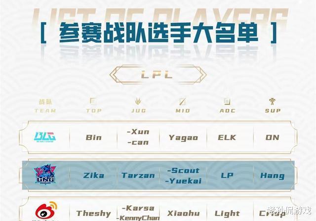 LNG官宣Scout入队之后,微博杯的参赛队和大名单就出来了,本届杯赛还蛮好玩。微博杯共有4支LPL和8支LDL队伍参加,BLG、LNG、WBG、OMG都选择首发主力选手,Scout也在名单当中。主办方自己的球队WBG全新阵容登场,上单TheShy,打野Karsa,中单小虎,下路Light,辅助Crisp,微博杯于12月30号份正式拉开帷幕,淘汰赛将只有LPL球队。