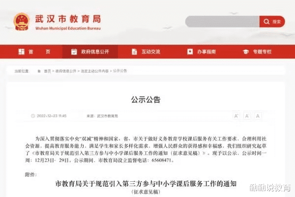 中小学生课后服务也出“幺蛾子”,第三方的引入,让家长措手不及课后延时服务,可以说是双减政策实施后留下的产物,一方面,是考虑现在双职家庭比较多,家长在接送孩子的时候并不是很方便,也是为了避免时间上的冲突,另一方面,学校可以利用课后延时服务这段时间,为同学们提供课后的指导,有些学校会为同学们提供辅导作业,有些学校也会培养同学们的兴趣爱好。虽然这种服务政策是收钱的,但家长也是乐在其中,就相当于即便孩子放学后,也有人帮忙看管,很大程度上减轻了家长的负担。 但是教育事业在不断发展,课后延时服务政策也不断作出调整,其中,武汉市教育局发布了“关于中小学课后服务引入第三方”的通知。这里所谓的“第三方”,主要是一些校外机构,以及社会专业人士两种类型,但校外机构是指一些非学科类的培训机构。但对于第三方的引入,很多家长措手不及,觉得这就是在间接的引入一些培训机构,虽然通知中明确指出,第三方参与课后服务,原则上不能超过总量的30%。 虽然这种服务政策也是需要同学们自主选择的,而且学校也需要先征求家长的意见,才能让同学们参与,但作为家长来说,并没有觉得是自主选择。虽然说第三方的引入不包含学科类,但如果身边有其他的家长给孩子选择,那么就会起到连带作用,有些家长就不得不选择,毕竟不想让孩子输在起跑线上。而且如今引进第三方,是不是也是在为后期引进学科类课后服务做铺垫,这成为家长比较担心的问题。